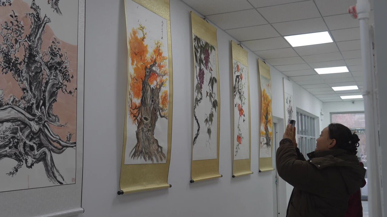 活动现场摆放10余幅作品,书法或刚劲或飘逸,绘画以胡杨、葡萄等元素展现团场风貌,传递作者对家乡的情感。职工群众驻足欣赏,交流品评。