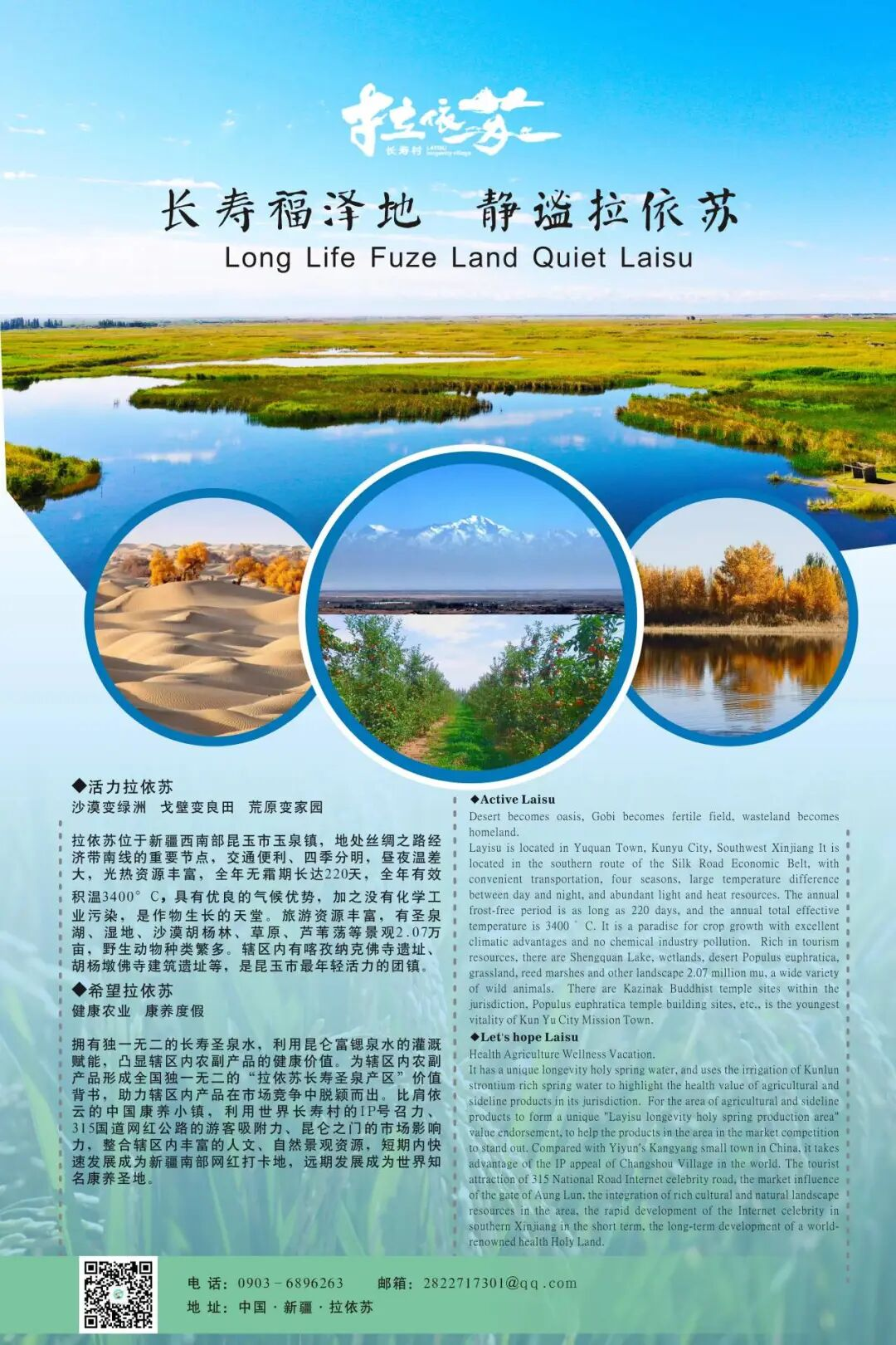 纯净的昆仑雪水,浸入三叠纪的亿年岩层,历经上百年层层矿化,通过八十公里亘古沙漠深层滤净,最终涌泉成流,铺开一片神奇的沙漠绿洲。这里有上万个泉眼,泉水四季不停,据有关部门测定,拉依苏村的水中含有充足的、对人体健康十分有益的微量元素,包括锶、镁、锰、铁、锌、钙等,其中锰元素为抗衰老元素,可以起到延年益寿的作用。圣泉湖直线长9.8公里,环绕20公里,湿地内有大量野生动物,如灰鹤、白鹭、棕头鸥、赤麻鸭、野猪、塔里木兔和野生鲫鱼、草鱼、鲤鱼、黑鱼等。万亩湿地两岸树木葱茏,柏油路蜿蜒迂回,金色的芦苇飘扬,湖面浮光跳跃,悠闲的野鸭,清脆的鸟鸣声在风中慢慢扩散开来,让这片湿地散发出水草丰美、杨柳依依,碧波荡漾,鸟儿低鸣的独特江南柔情,沿湖而建的生态林带和金黄色的芦苇,与波光粼粼的湖面构成一幅大漠里的江南画卷。