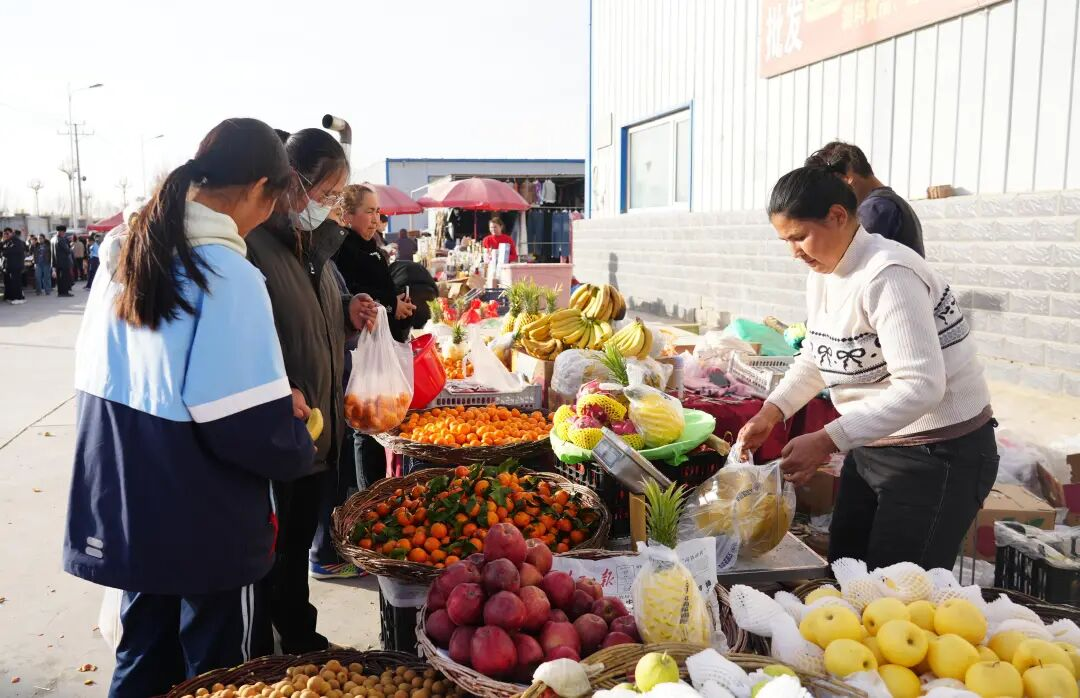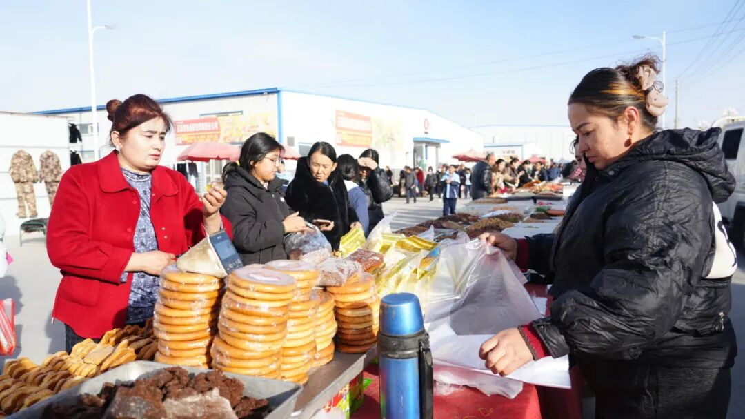近日,二二五团农贸市场内人声鼎沸。随着新春佳节临近,每周五如期开启的集市进入热闹模式,此起彼伏的吆喝声萦绕耳畔,各类摊位沿着整洁的道路分区明确,果蔬、美食、干果等一目了然。