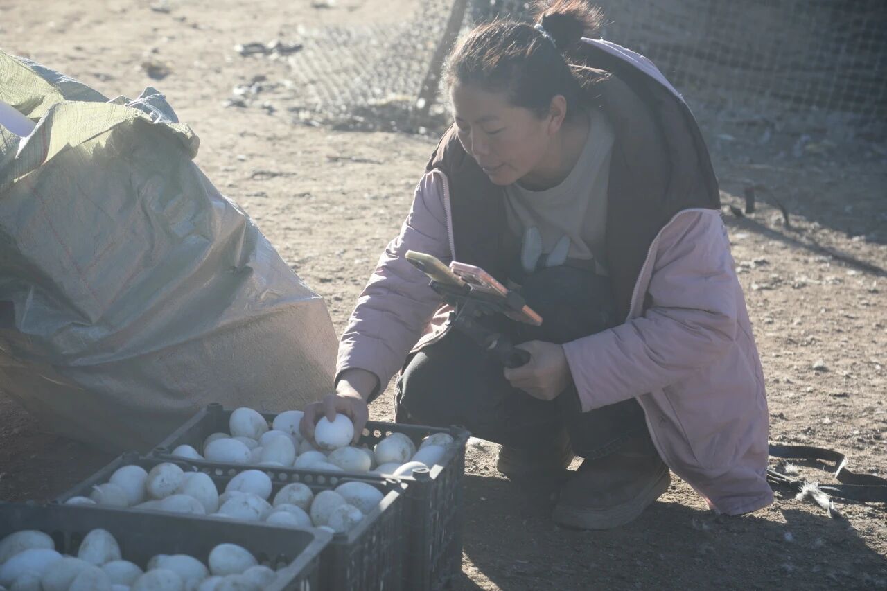 此次销售的鹅蛋来自皮山农场八连泰州鹅养殖合作社,由王克群经营,目前养殖了4000只泰州鹅,每只鹅一年能产蛋70枚左右。这里的泰州鹅在红柳林与枣林间自由穿梭,构成了 “鹅养林、林育鹅” 的生态循环模式。“等天气暖和了,枣园里长满青草绿叶,鹅群在枣林下觅食的画面更有看点,到时候流量肯定会更高。今年我会继续推广咱们皮山农场的生态鹅蛋。”赵玉梅说。