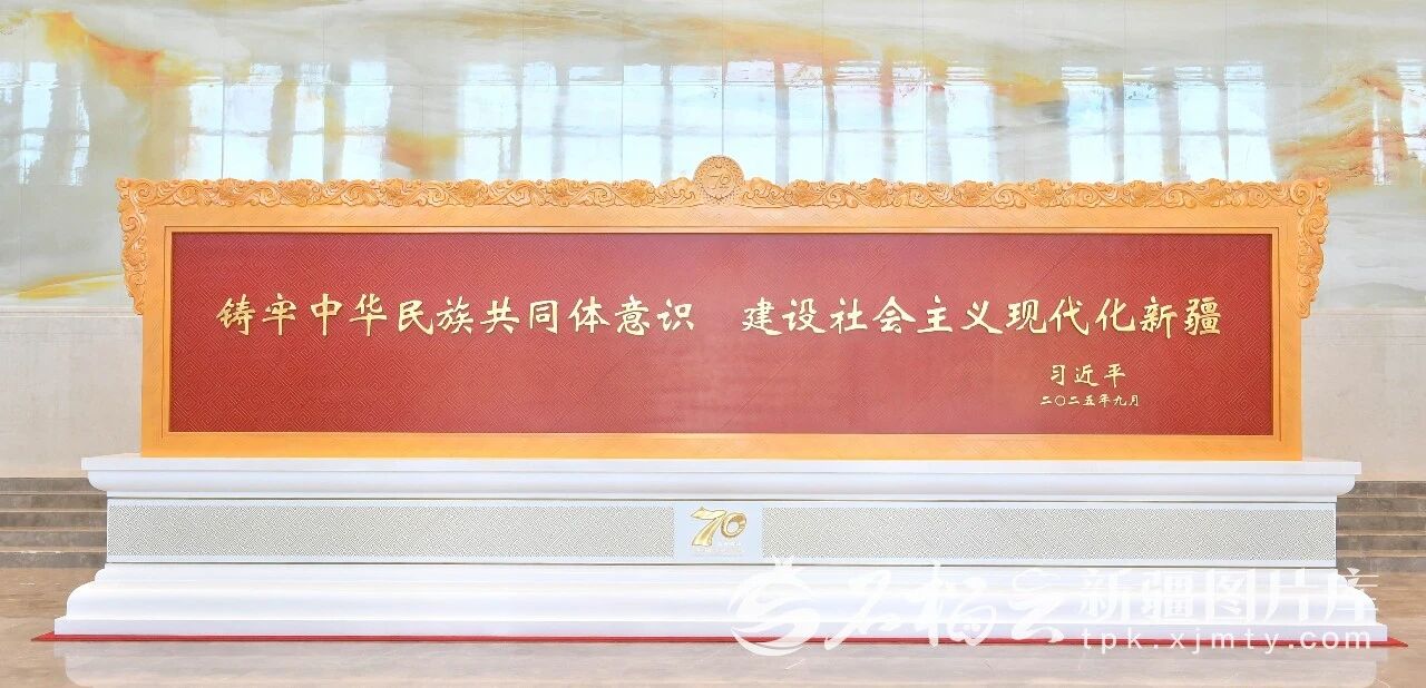 党中央赠送新疆的贺匾上,习近平总书记题词“铸牢中华民族共同体意识 建设社会主义现代化新疆”金色大字格外醒目。