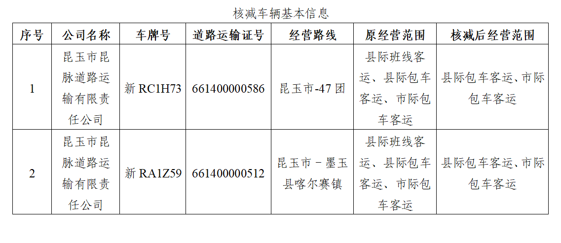 根据《道路旅客运输及客运站管理规定》第五十七条第一款“客运包车应当凭车籍所在地道路运输管理机构配发的包车客运标志牌,按照约定的时间、起始地、目的地和线路运行,并持有包车合同,不得招揽包车合同外的旅客乘车”的规定。经核查,昆玉市昆脉道路运输有限责任公司已违反上述规定,该公司向我局提出申请,要求核减新RC1H73昆玉市-47团及新RA1Z59昆玉市-墨玉县喀尔赛镇经营线路,保留县际包车、市际包车,现对核减事项予以公示,公示期7个工作日。