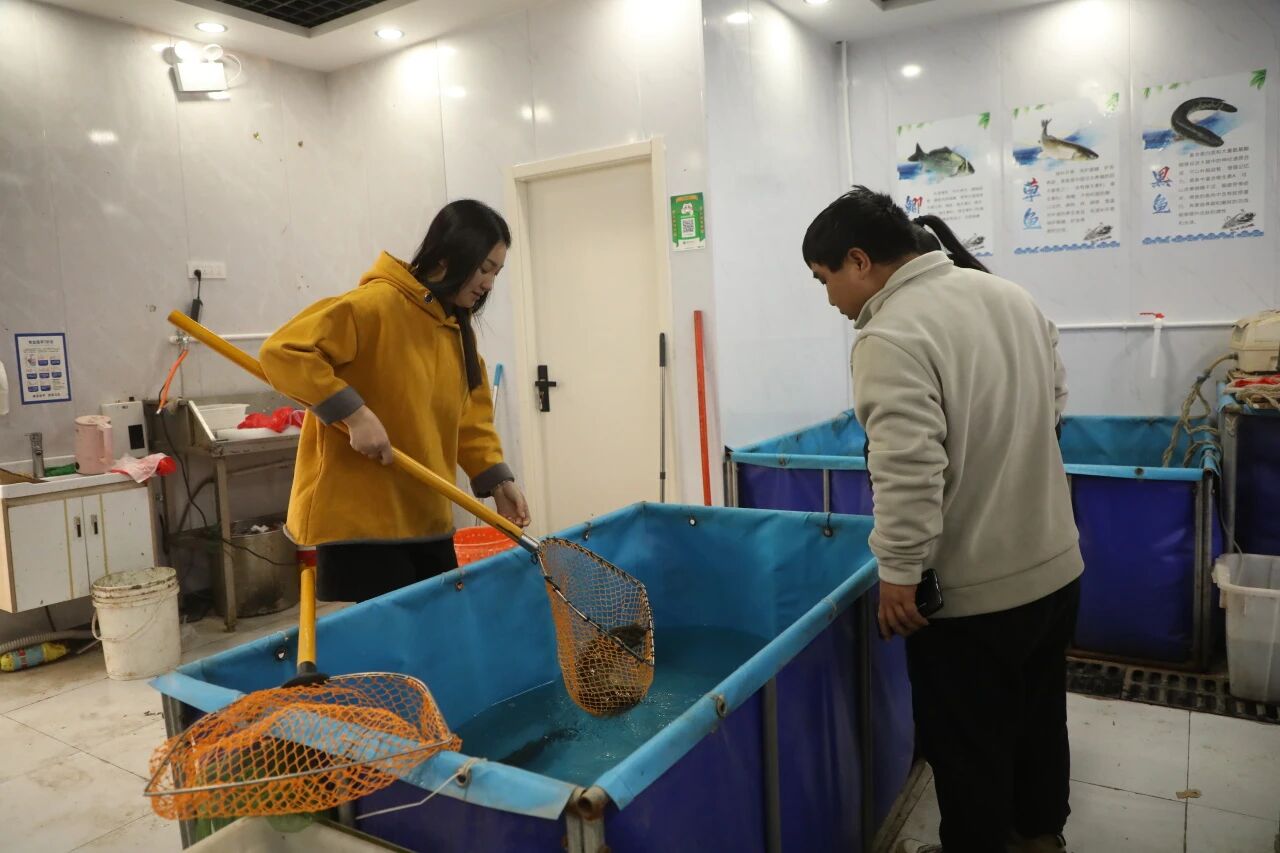 在水库鱼海鲜冻品店,鲜活的鱼、肥美的虾蟹等水产品琳琅满目。店主李梅一边为顾客挑选,一边说道:“越近年关,海鲜销售越旺。我们的鱼每天从水库现捞,保证新鲜供应。”