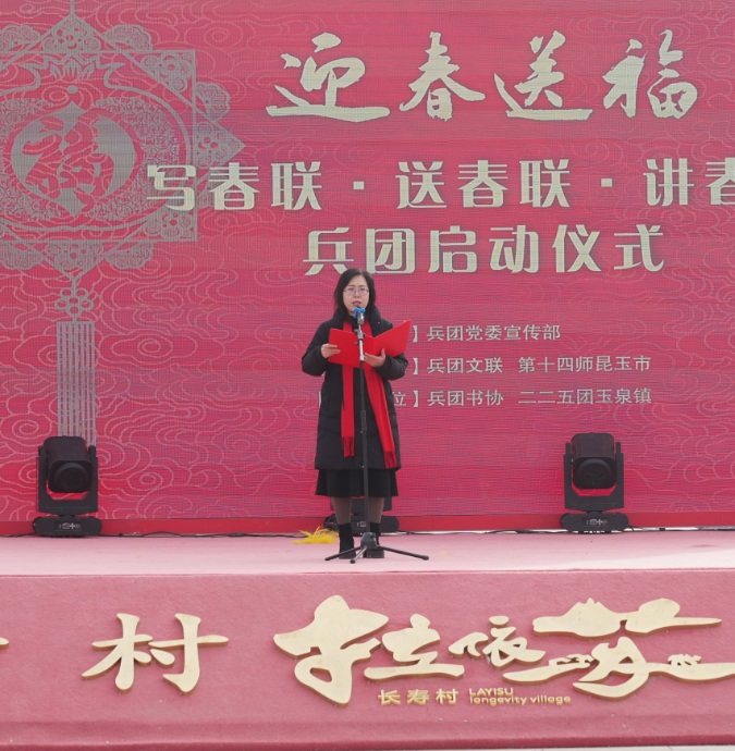 师市党委常委、纪委书记王勇致欢迎辞,向莅临现场的各级领导、各位书法家和职工群众表示诚挚问候和祝福。兵团党委宣传部副部长徐丽在致辞中指出,“迎春送福”写春联、送春联、讲春联活动系列文化主题活动不仅是对兵团广大干部职工群众的新春祝福,更是传统文化的当代表达和凝心聚力的时代实践。