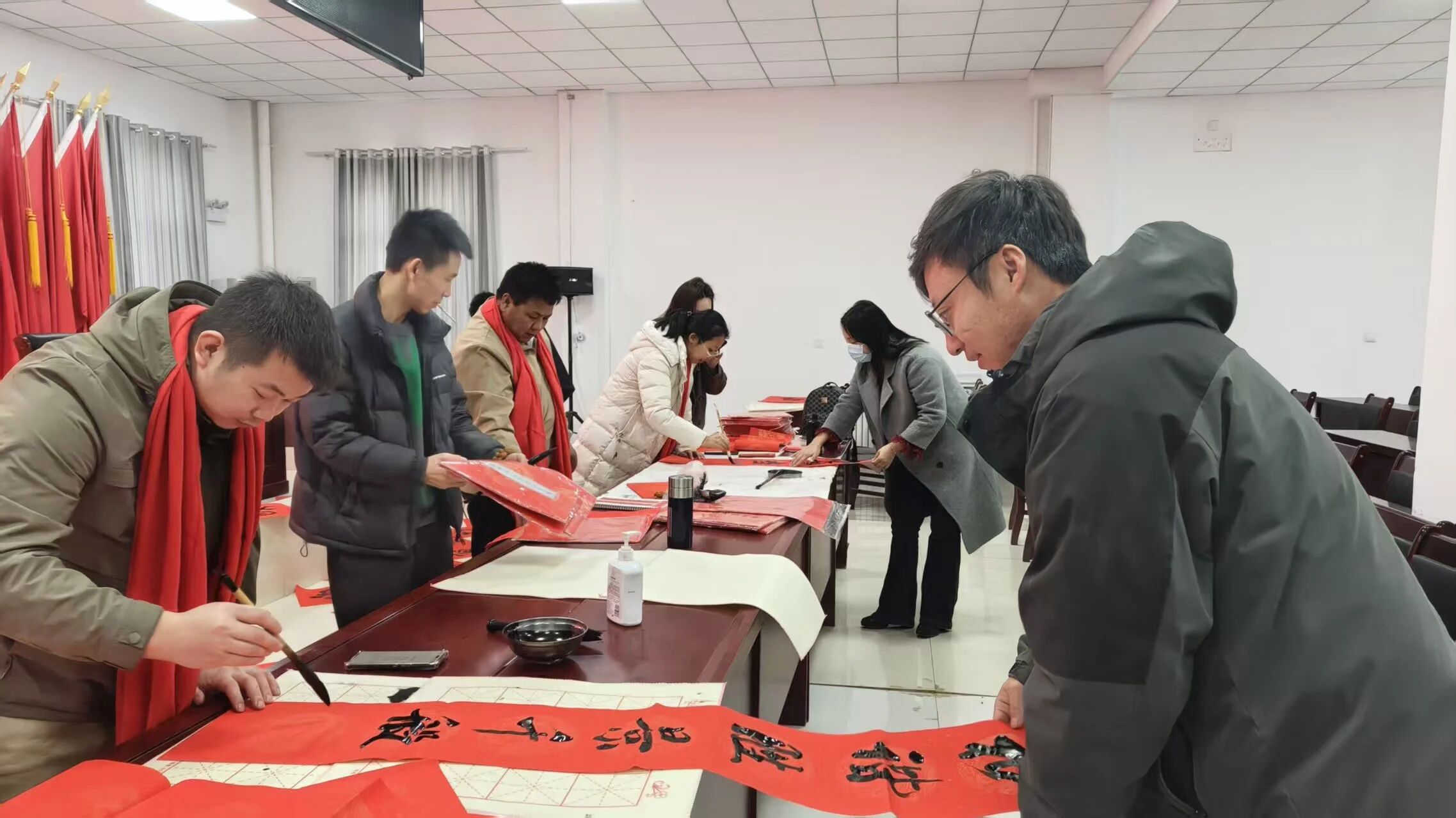 同日,师市文联四位书法老师应邀走进第十四师法院,开展送春联专场活动。铺纸、研墨、挥毫一气呵成,现场墨香四溢。法院干警热情参与,在笔墨流转间挑选自己喜爱的春联内容。大家纷纷表示,手写的春联更具温度与仪式感,不仅增添了年味,也让人深切感受到组织的关怀与温暖。