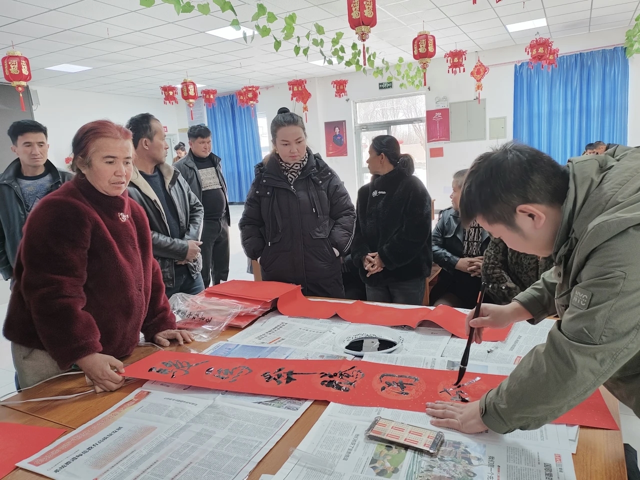 2月10日,在于田县兰干博孜亚农场奥吐拉博孜亚村,活动同样暖意融融。村民们围拢在案前,一边挑选心仪联语,一边与书法老师交流春联的寓意与用法,气氛热烈而温馨。活动当天共计赠送春联700余幅。