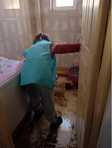 抵达现场后,网格员发现厨房内积水严重,地面已被污水大面积浸泡,墙面也因长时间渗水出现明显湿痕,若不及时处理,积水极易蔓延至其他房间,甚至渗漏至楼下,造成更大损失。危急时刻,网格员迅速行动、分工协作,一边紧急联系维修师傅到场,协助师傅关闭供水总阀、精准排查漏水点位;一边拿起拖把、水桶等工具,快速清理地面积水,全力减少渗水对房屋及家具的损害。