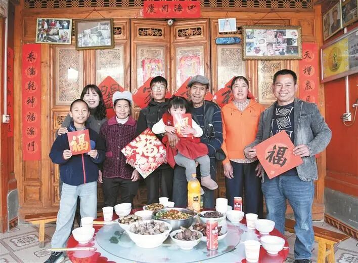 2月16日,在云南省大理白族自治州剑川县马登镇文屏村,一家人在吃“团圆饭”前合影。 新华社发(赵庆祖 摄)