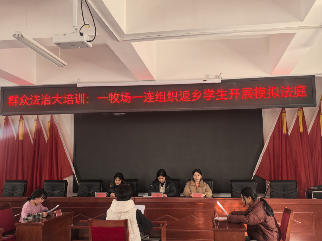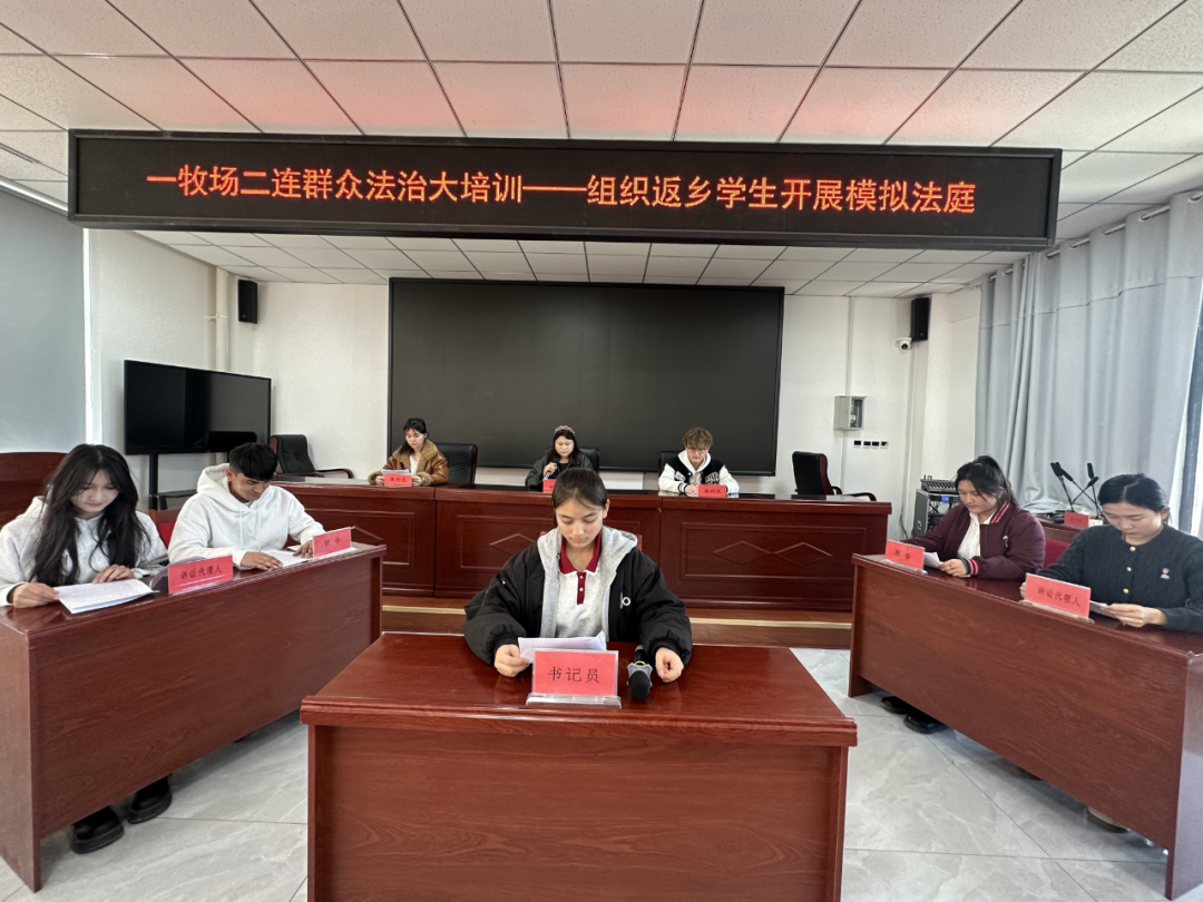 新春伊始,为全面推进群众法治大培训走深走实,持续提升基层普法工作质效,近日,一牧场各连队(社区)统一部署、同步发力,以“青春学法践初心 模拟法庭普新法”为主题,利用春节返乡契机,组织返乡大学生开展沉浸式模拟法庭系列普法活动,把法治课堂搬到群众身边,让法治精神在新春佳节浸润牧场千家万户。