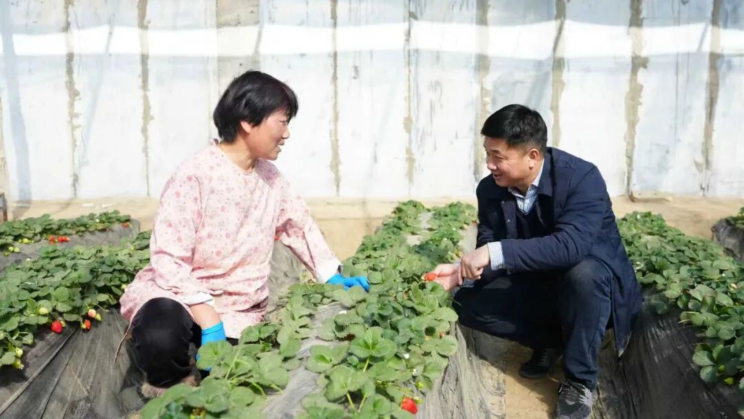 2月12日,赵小良(右)察看草莓生长情况,并向种植户了解种植过程中遇到的困难和需求。韦佩珊 摄