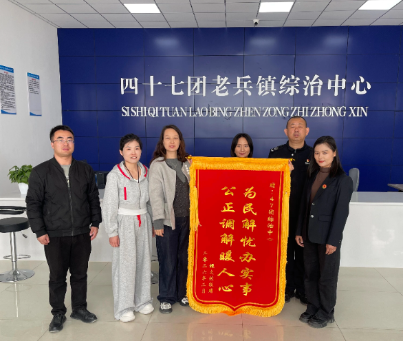 一面锦旗,一份认可,更是一份责任。近年来,四十七团综治中心深入践行新时代“枫桥经验”,坚持把矛盾纠纷化解在基层、化解在萌芽状态,聚焦职工群众急难愁盼问题,持续健全多部门联动调处机制,不断提升基层矛盾化解效能。下一步,中心将继续坚守为民服务初心,以更实作风、更优举措办好群众身边事,全力守护辖区和谐稳定,切实提升职工群众的获得感、幸福感、安全感。