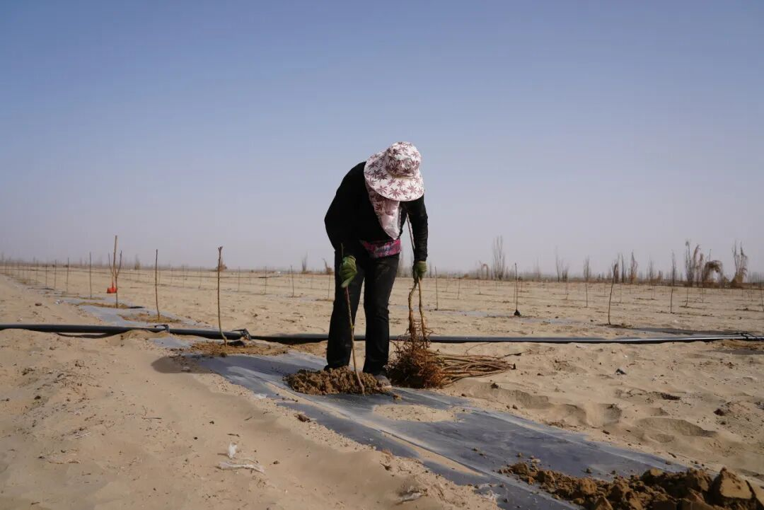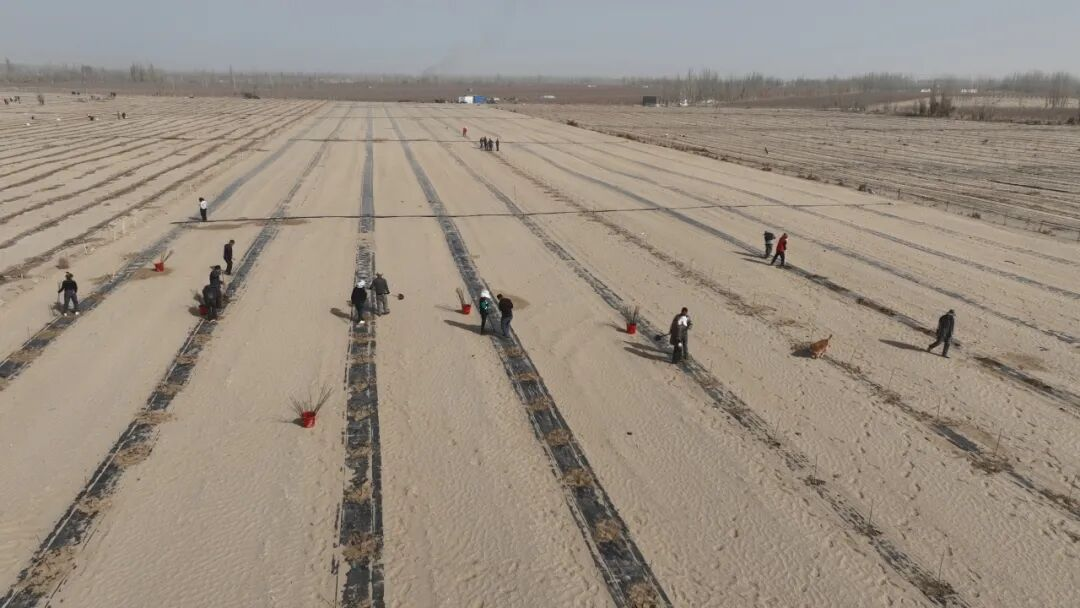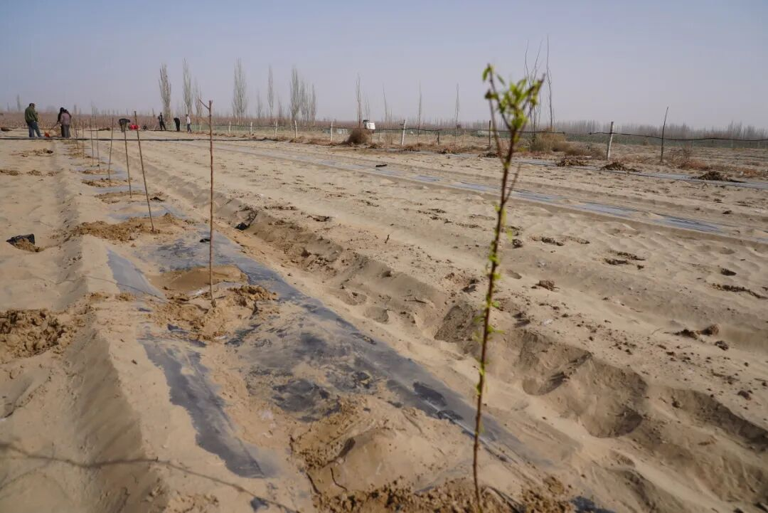 3月28日,四十七团七连的农田里铺满地膜,40余名连队“两委”成员与职工群众正忙着栽种蜂糖李树苗、挖坑、定植、培土,一道道工序有条不紊。