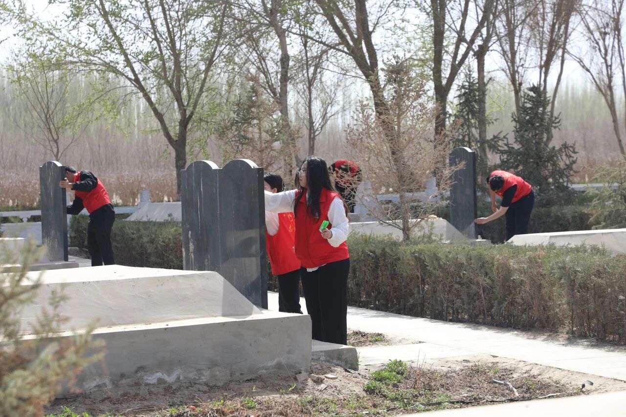 师生们擦拭墓碑