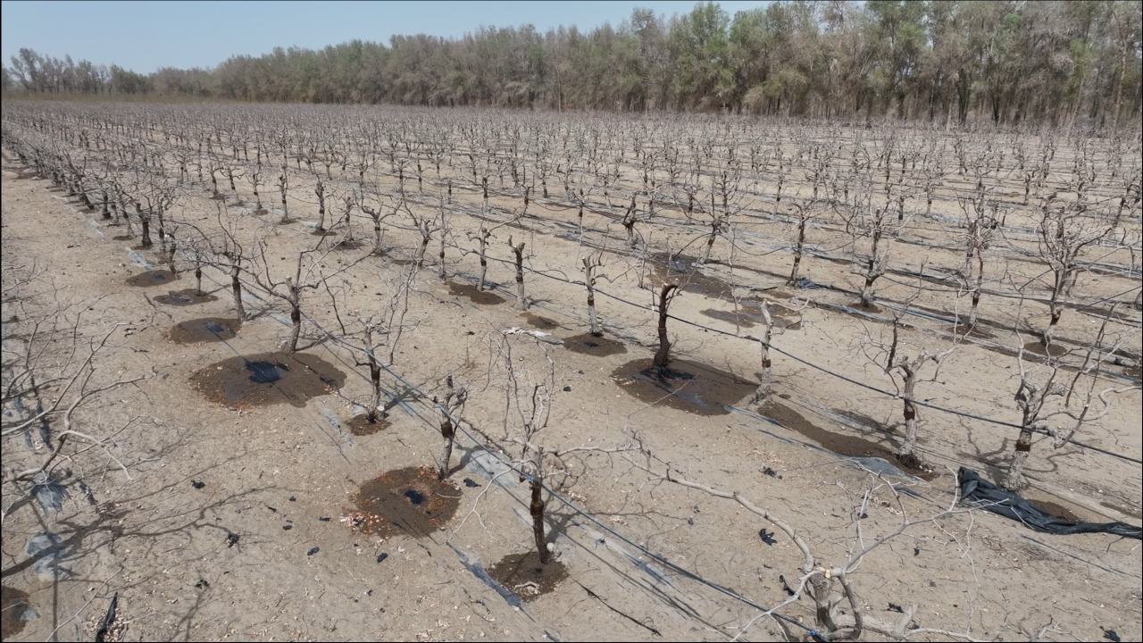 专利研发团队成员、第十四师农业科学研究所工作人员李冰洁介绍道:“除了红枣树修剪方法的创新,这项专利技术还有很多亮点,一是通过大树移栽技术,优化枣园种植密度,移栽枣树成活率高达99%,让枣园长势更整齐;二是独创防虫隔离带,有效阻隔害虫攀爬;三是创新空中灌溉模式,在红枣树主干高80厘米左右处架设灌溉管,替代传统易堵塞、易老化的滴灌带,一次铺设可使用两年以上,搭配稳流器实现水肥精准直达根系,减少水分蒸发,让枣树根系更发达,同时避开清园、修剪时间冲突,实现早春提前灌水,保障枣树生长需求;四是倒‘V’字形起垄与防草地布,既保湿抑草,又方便红枣采收,全程实现管护轻量化、高效化。”