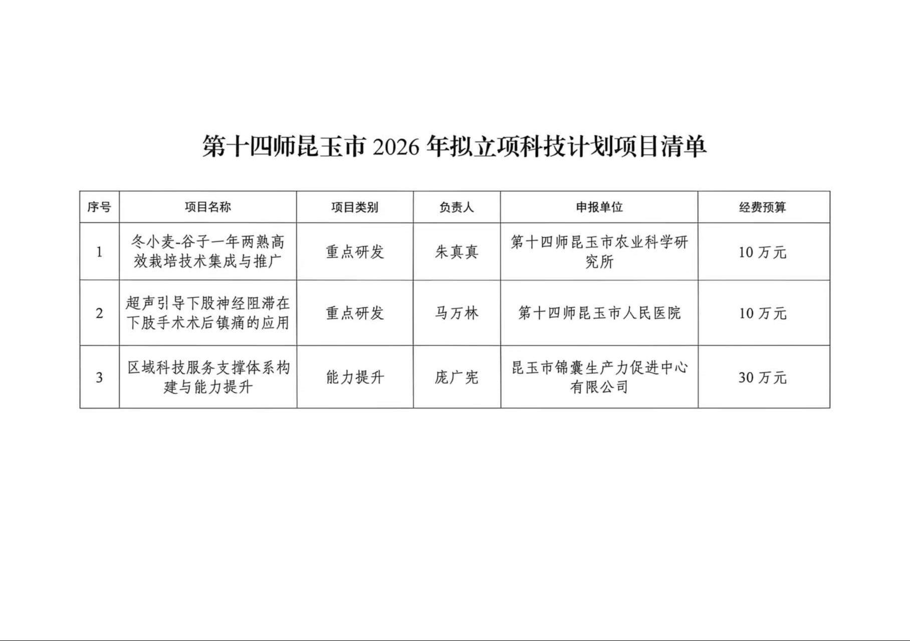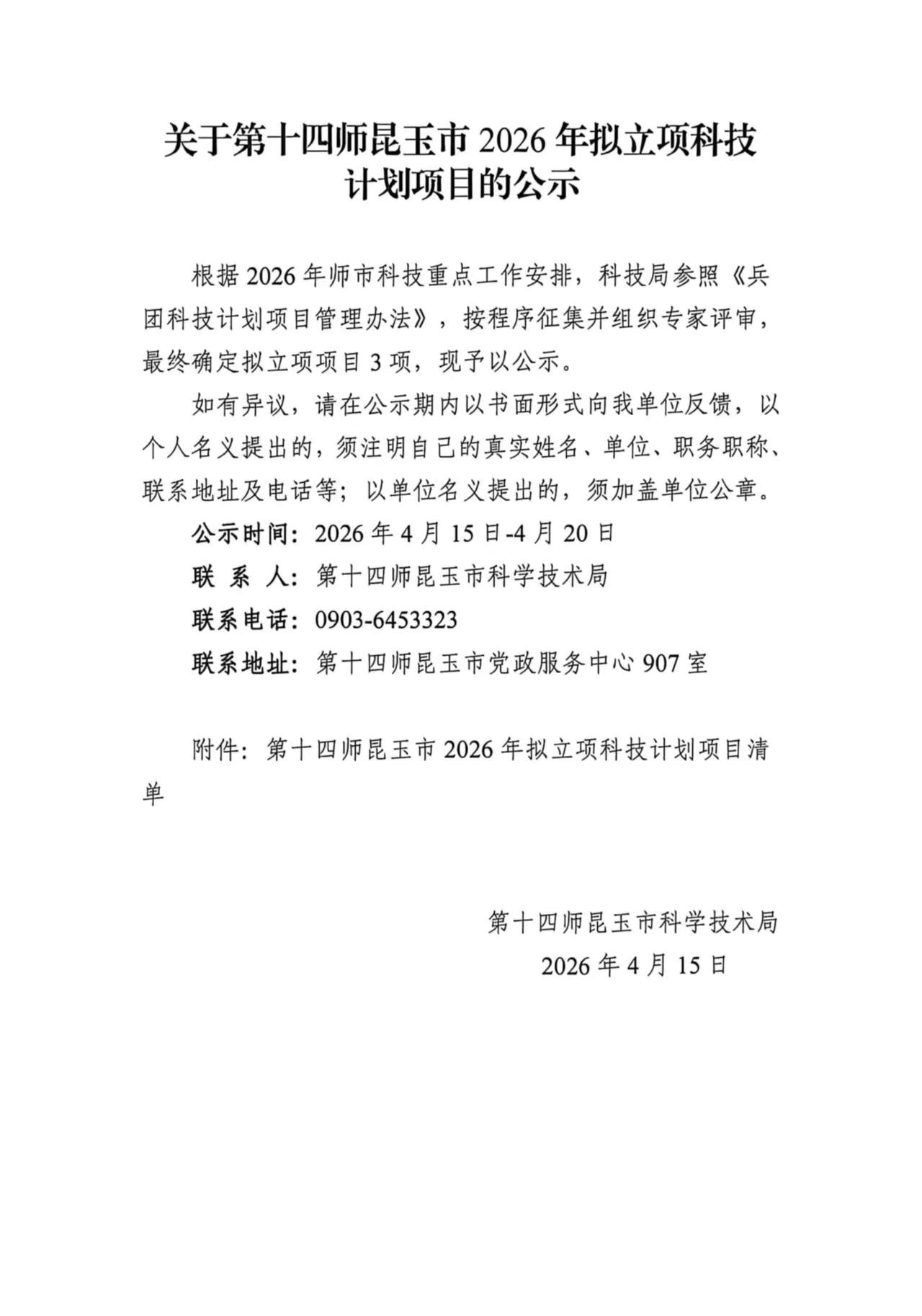 关于第十四师昆玉市2026年拟立项科技计划项目的公示