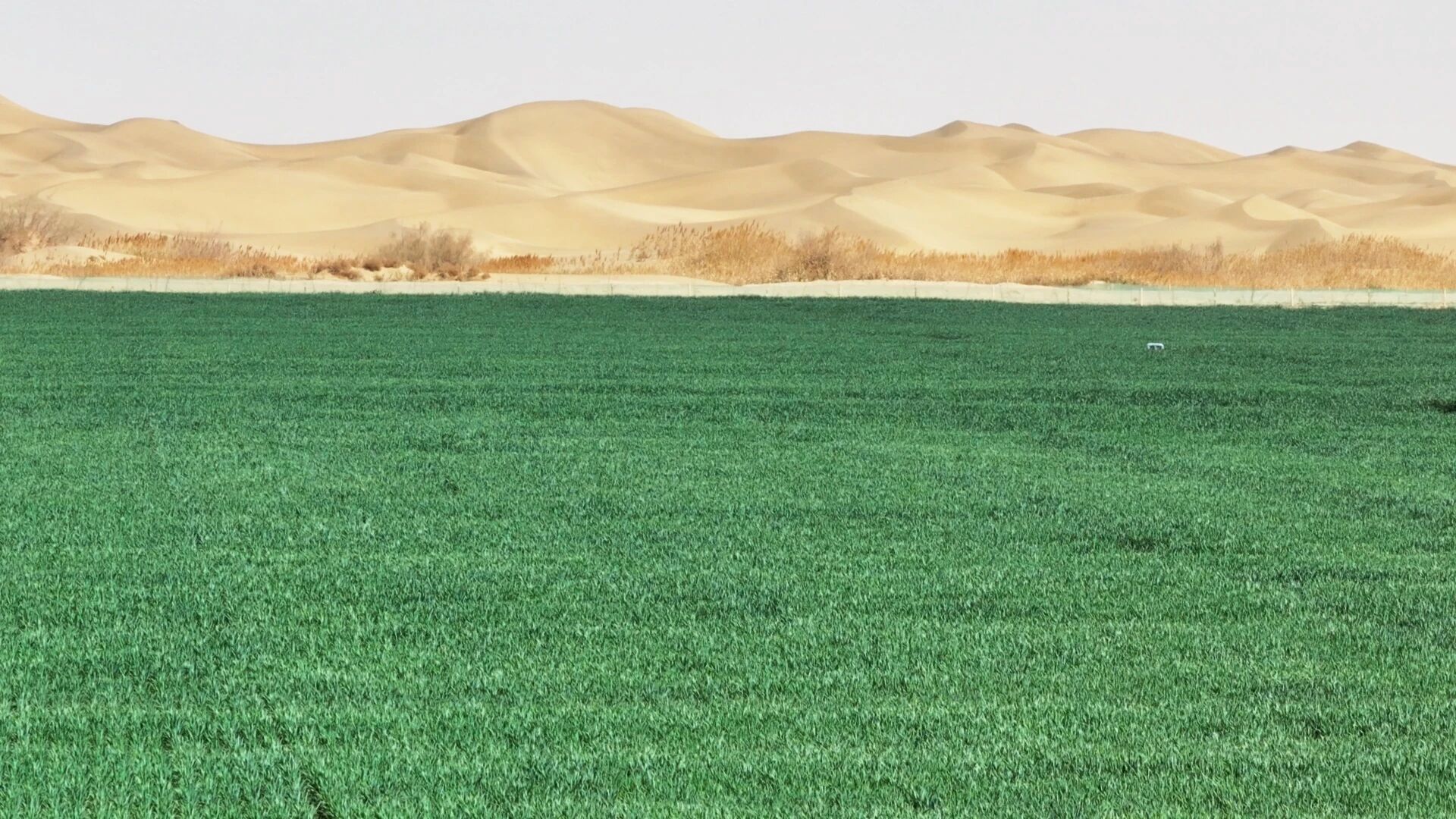 曾经的沙荒地已变身长势喜人的连片麦田,翠绿的作物与远处的沙丘形成鲜明对比。