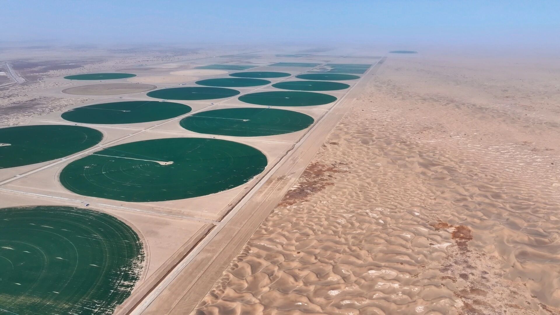 绿色“同心圆”阵列铺展眼前,让昔日苍茫沙海蜕变为连片良田,绘就沙漠边缘的生态富民新画卷。