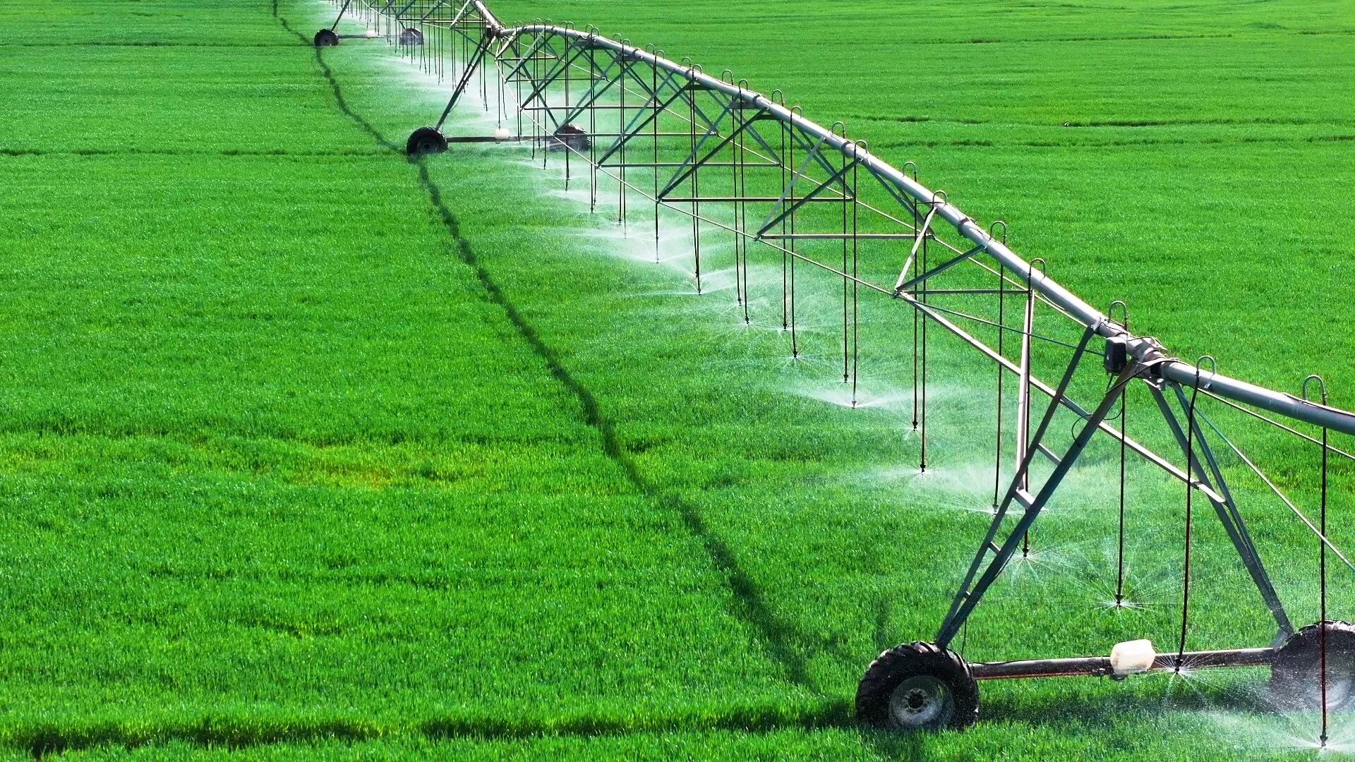 喷灌机臂架上的喷头均匀喷洒水雾,不仅为作物补水,更能有效清理叶面尘土、降低田间扬尘,在沙漠治理中发挥多重生态效益。