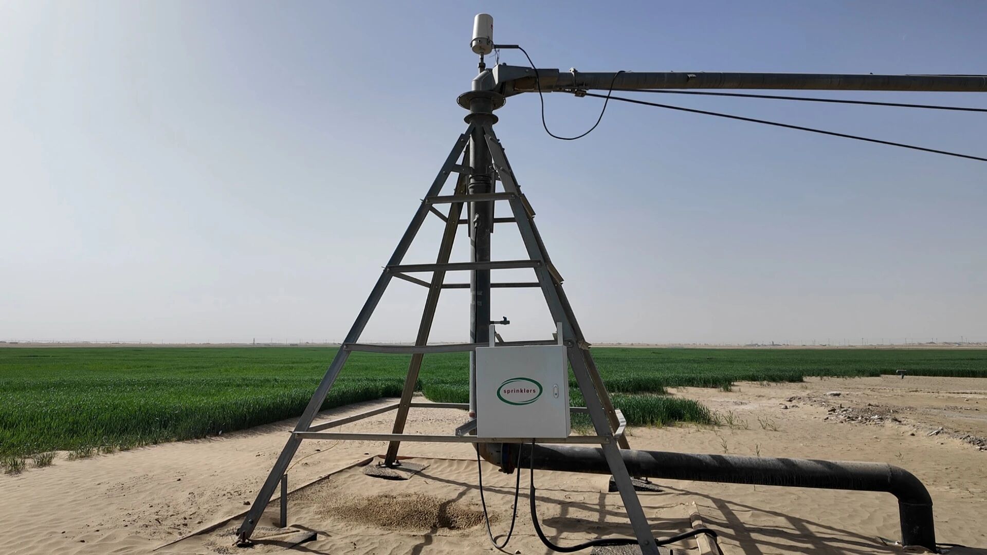喷灌机中心控制塔架矗立在沙地上,配套智能控制系统,精准调控灌溉作业。