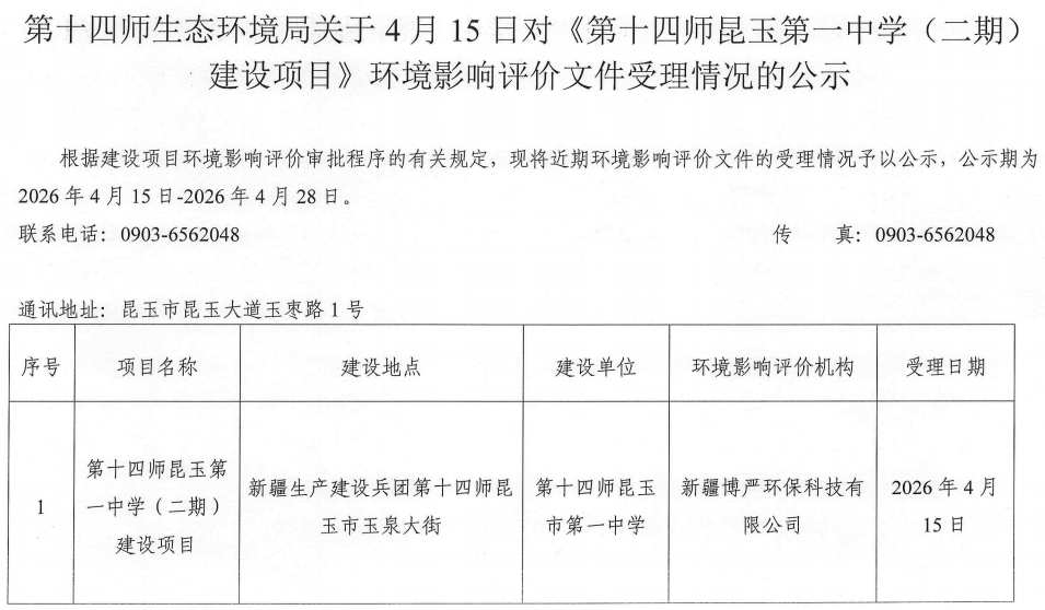 第十四师生态环境局关于4月15日对《第十四师昆玉第一中学(二期)建设项目》环境影响评价文件受理情况的公示