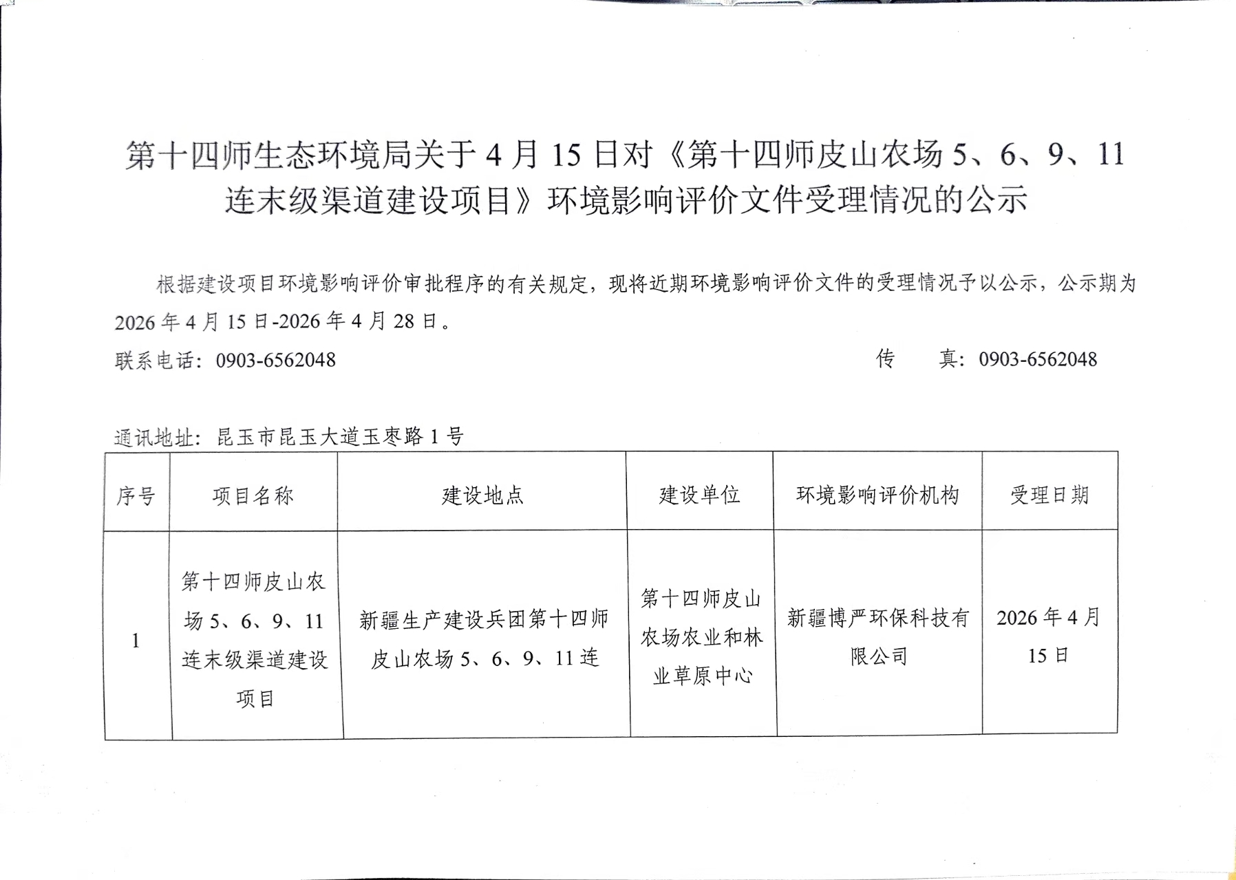第十四师生态环境局关于4月15日对《第十四师皮山农场5、6、9、11连末级渠道建设项目》环境影响评价文件受理情况的公示