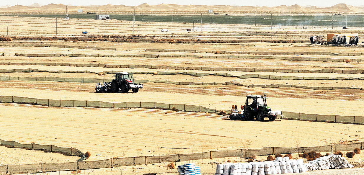 4月14日,十四师二二四团职工在塔克拉玛干沙漠边缘播种小茴香。 兵团日报全媒体记者 王志清 摄 一师阿拉尔市将植树造林与特色林果产业深度融合,林果种植面积稳定在100万亩以上,形成苹果、香梨、红枣、杏李等特色林果多元发展格局,并大力推广“乔灌结合、林药间作”等模式,让生态林变为职工群众的“致富林”;十四师昆玉市积极探索“生态+产业”发展路径,鼓励职工在梭梭树下套种肉苁蓉,引进精深加工企业打造全产业链,让戈壁荒滩变成“聚宝盆”。