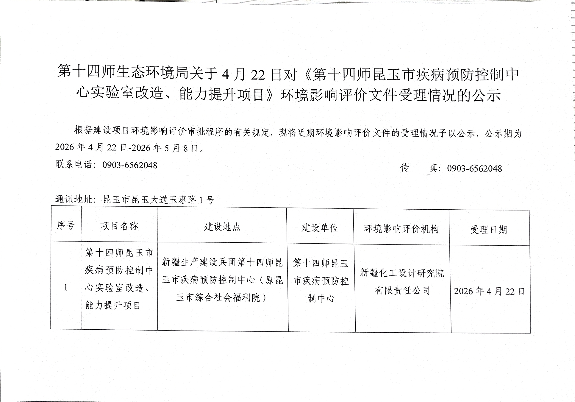 第十四师生态环境局关于4月22日对《第十四师昆玉市疾病预防控制中心实验室改造、能力提升项目》环境影响评价文件受理情况的公示