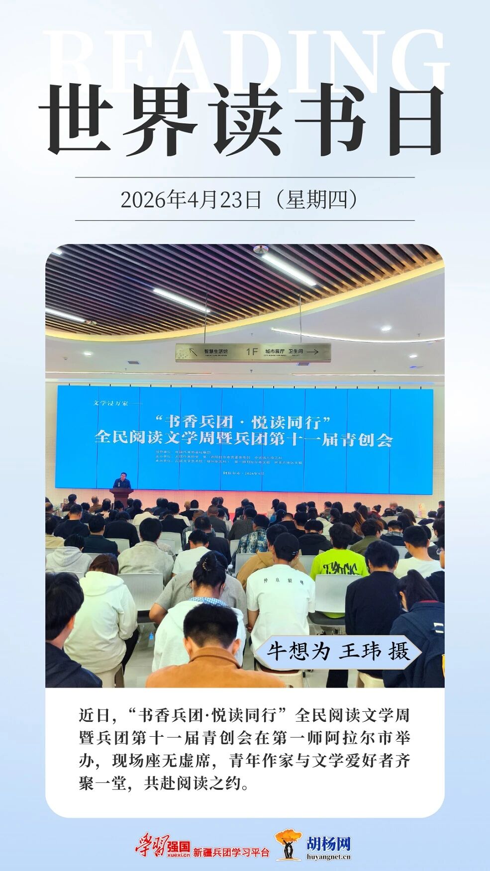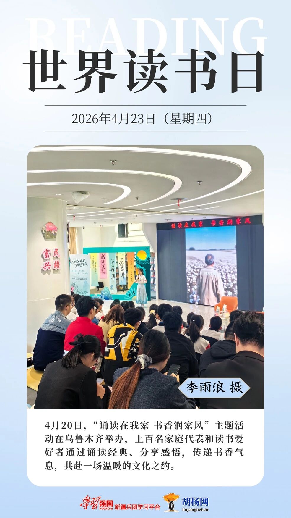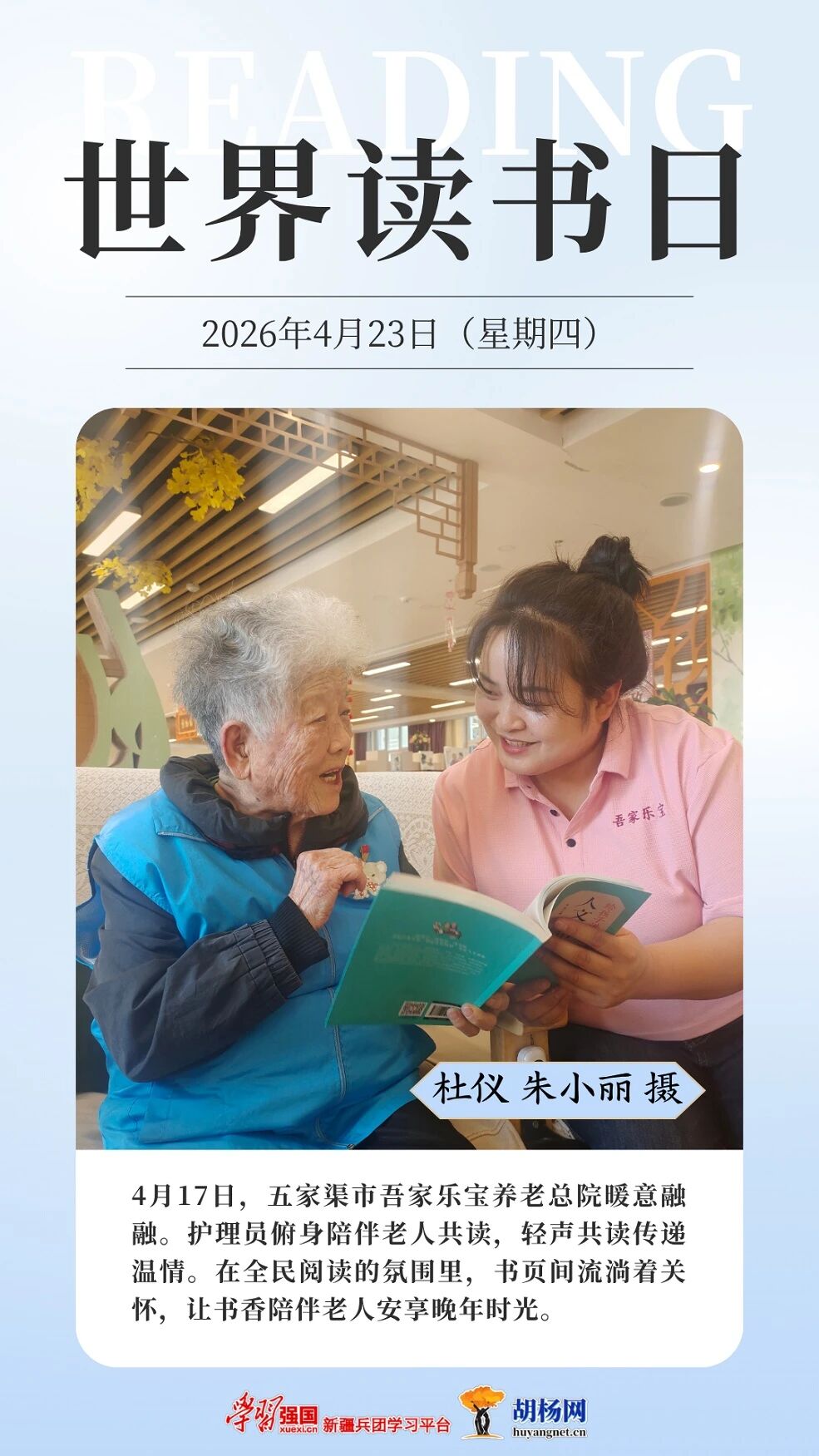 今年4月23日是第30个“世界读书日”。连日来,兵团各地同步掀起形式多样的全民阅读热潮。从校园图书馆里学子们沉浸阅读的专注身影,到养老院内护理员陪伴老人共读的温馨场景,再到文学周中青年作家与文学爱好者的热烈交流,书香正浸润兵团的一个角落。