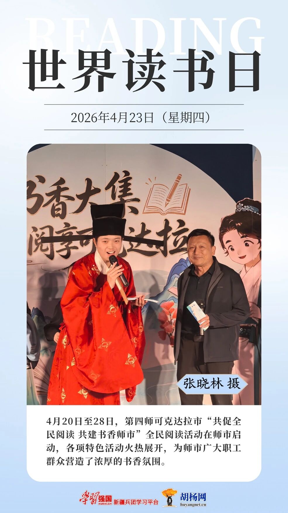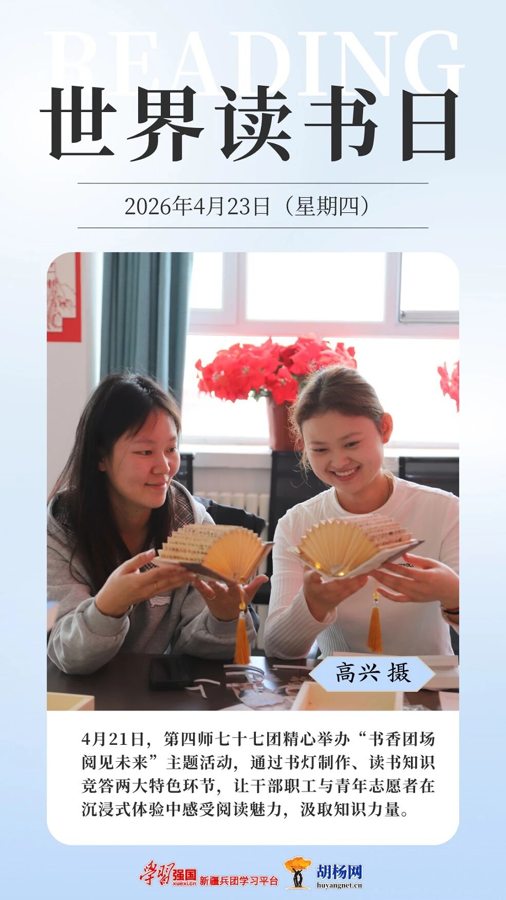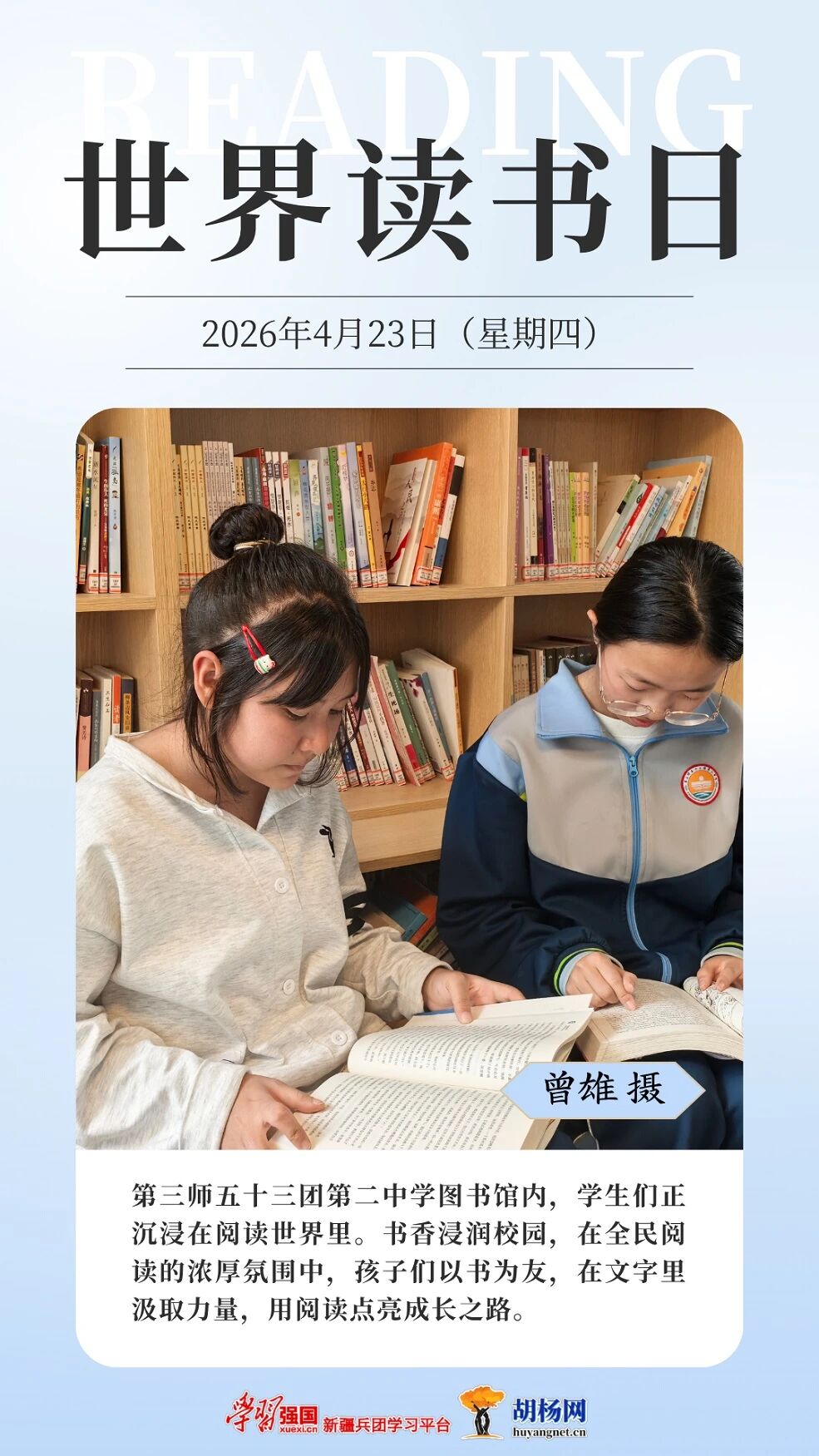 今年4月23日是第30个“世界读书日”。连日来,兵团各地同步掀起形式多样的全民阅读热潮。从校园图书馆里学子们沉浸阅读的专注身影,到养老院内护理员陪伴老人共读的温馨场景,再到文学周中青年作家与文学爱好者的热烈交流,书香正浸润兵团的一个角落。
