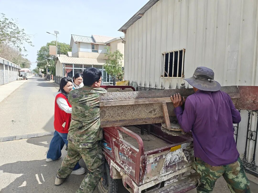 连队职工因独自搬运大件农机设备存在困难,二连工作人员和调解员得知情况后,立即主动上前帮忙。大家分工协作、齐心协力,合力将沉重的农机设备抬上三轮车,确保设备安全固定、平稳装载,有效避免了设备磕碰损坏和职工独自搬运的安全风险。